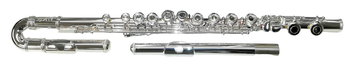 Flauta Transversal com cabeça corpo e chaves prateadas, com pratos abertos e desalinhados, estojo, cabeça curva incluída.