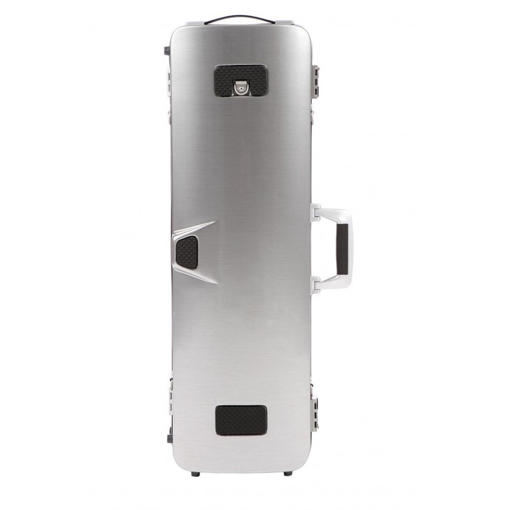 Estojo para violino da série Hightech. Estrutura tripla Hightech: ABS, Airex e ABS, duas alças antiderrapantes de neoprene com mosquetões de segurança, duas fechaduras com chave, alça lateral confortável, pés de borracha antiderrapantes. Parte superior em pele, parte inferior em alumínio escovado. O instrumento fica totalmente suspenso no seu interior em almofadas de espuma. 4 Suportes para arco, correia para almofada tipo Kun. Bolsa interior extraível .