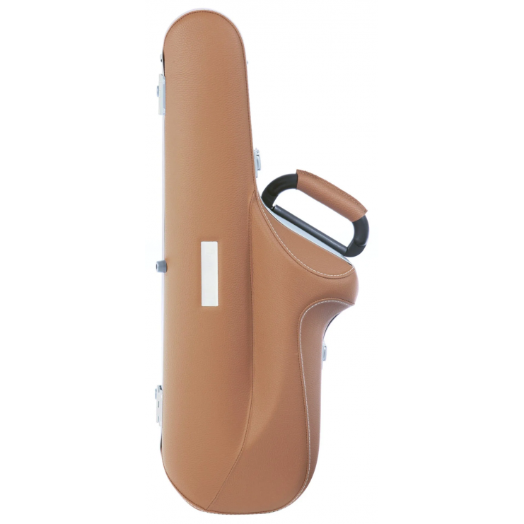 Estojo para saxofone Alto com tampa e base cobertas com pele natural. Tem duas correias acolchoadas tipo mochila e extraíveis, asa lateral, duas fechaduras BAM com chave.