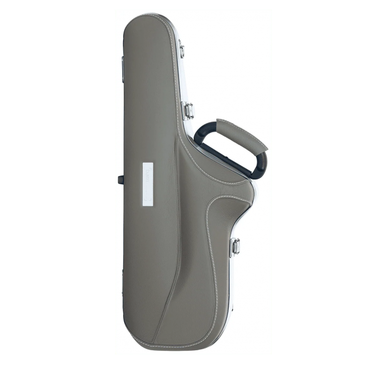 Estojo para saxofone Alto com tampa e base cobertas com pele natural. Tem duas correias acolchoadas tipo mochila e extraíveis, asa lateral, duas fechaduras BAM com chave.