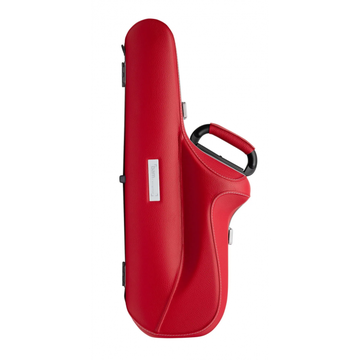 Estojo para saxofone Alto com tampa e base cobertas com pele natural. Tem duas correias acolchoadas tipo mochila e extraíveis, asa lateral, duas fechaduras BAM com chave.