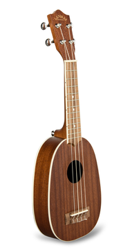 Ukulele Soprano, formato ananás, em mogno. Corpo e braço em Caoba. Carrilhões metálicos.