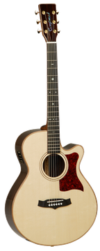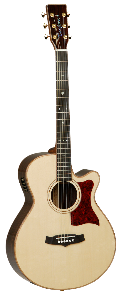 Guitarra acústica eletrificada, formato super folk com cutaway. Série Heritage. Tampo em abeto maciço. Lados e fundo em Pau Santo maciço. Escal em ébano. Cordas Elixir Nanoweb 12-53. EQ LR Baggs Stage Pro Element. Inclui estojo TW-ABS.