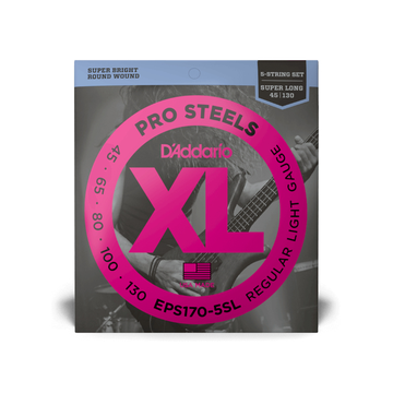 Jogo de 5 cordas de baixo elétrico. Escala Super Longa. Tensão Light. Cordas em aço inoxidável. Calibre: 045, 065, 080, 100, 130.