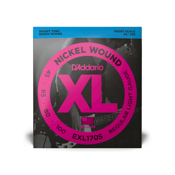 Jogo de 4 cordas para baixo elétrico. Escala Curta. Light. Cordas em nickel. Calibre: 045, 065, 080, 100.