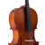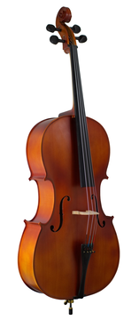 Violoncelo com tampo em abet maciço, laterais e fundo em Ácer, estandarte com 4 afinadores, arco, resina e saco com mochilas e bolsa exterior, acabamento envelhecido.