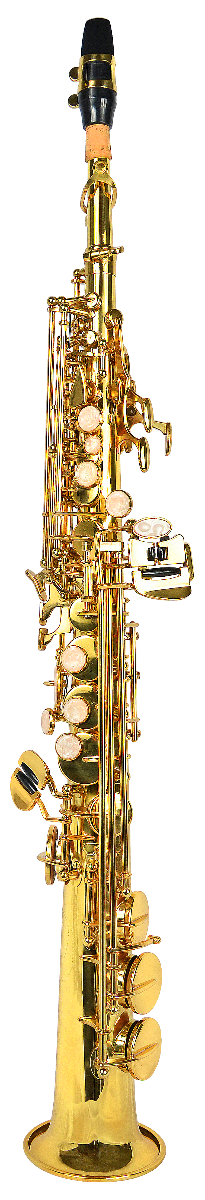 Saxofone Soprano Sib, registo Sib-Fa#, sapatilhas e molas feitas em Itália, acabamento lacado, com estojo e acessórios.