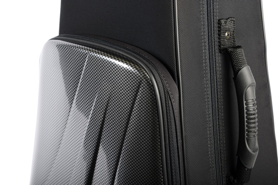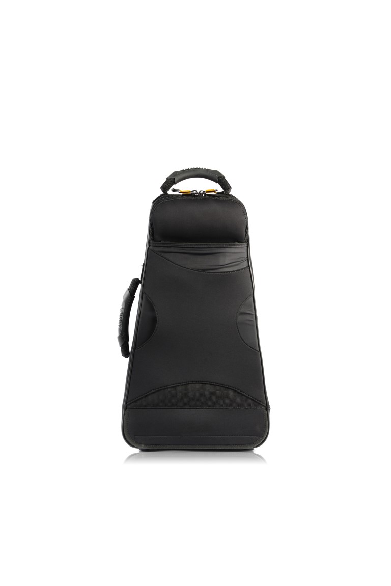 Estojo de Trompete ultracompacto. Tipo mochila com duas alças retractéis. Impermeável em caso de chuvas fortes. Cor carbono prateado.