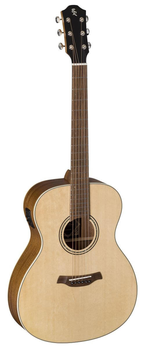 Guitarra acústica eletrificada, formato Parlour. Tampo em pinho. Lados e fundo em mogno. Escala em laurel. Carrilhões cromados. Pente e pestana em osso. Pickup BR1. Cordas D’Addario EXP. Acabamento natural acetinado.