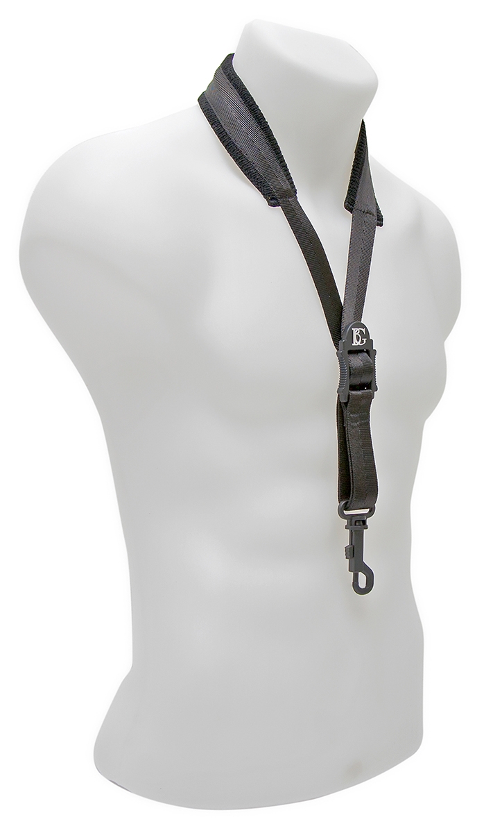 Correia “Confort”, em nylon preto, reforço almofadado, com mosquetão, para Sax Alto ou Tenor.