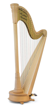 Harpa de pedal de 47 cordas, construida em ácer e faia. Acabamentos em mogno, cerejeira, nogueira, ácer natural e preto.