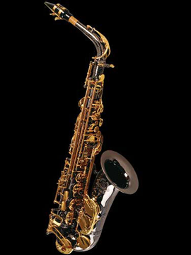 Saxofone Alto da série Big Bell, 2 tudeis customizados à mão (um original e um tudel FAT banhado a prata), 17 pedras semi-preciosas, Fá # agudo, sapatilhas italianas water-resistant em pele com feltros em algodão, molas em aço inox, acabamento Black Nickel polido, chaves douradas. Boquilha e estojo incluídos.