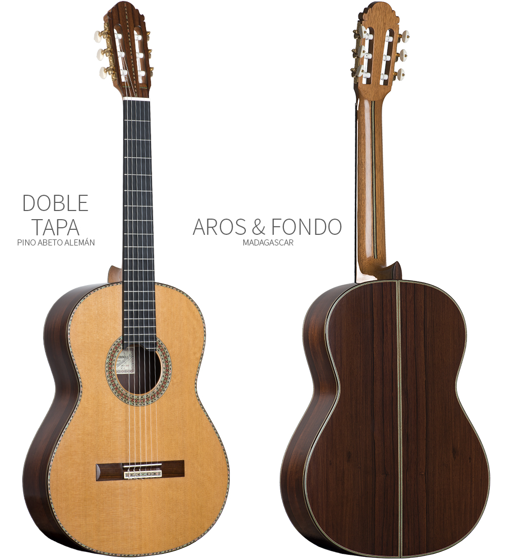 Guitarra clássica espanhola de Luthier, gama profissional, fabricada artesanalmente por Casimiro Lozano, tampo maciço ou duplo tampo de Cedro Vermelho do Canadá, aros e fundo em Madagascar com duplo aro, braço em Cedro, escala em Ébano, verniz Goma Laca, escala 650mm (opcional 640mm ou 660mm).