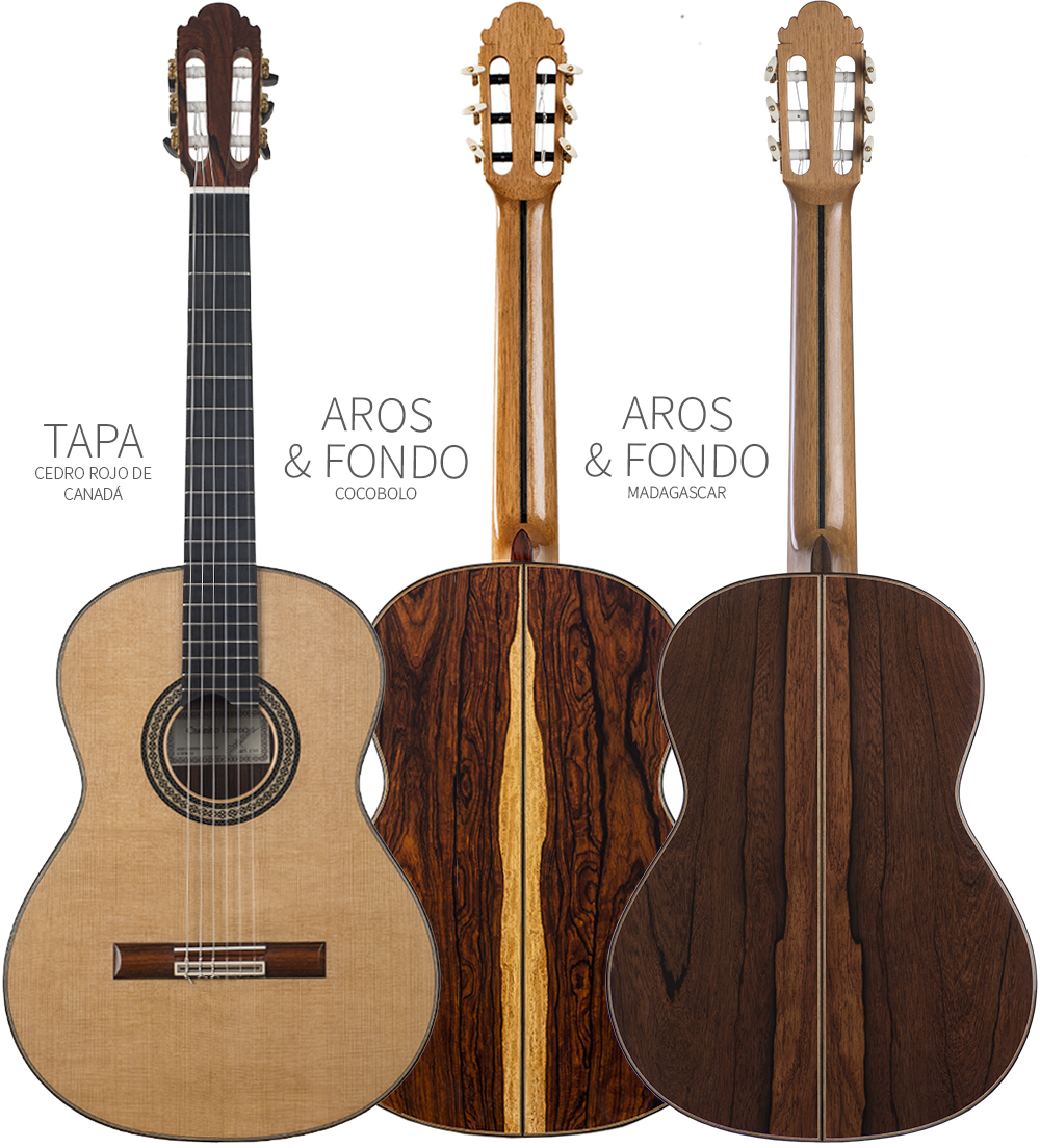 Guitarra clássica espanhola de Luthier, gama profissional, fabricada artesanalmente por Casimiro Lozano, tampo maciço ou duplo tampo de Cedro Vermelho do Canadá, aros e fundo em Cocobolo ou Madagascar (duplo aro opcional), braço em Cedro, escala em Ébano, verniz Goma Laca, escala 650mm (opcional 640mm ou 660mm).