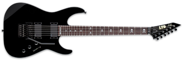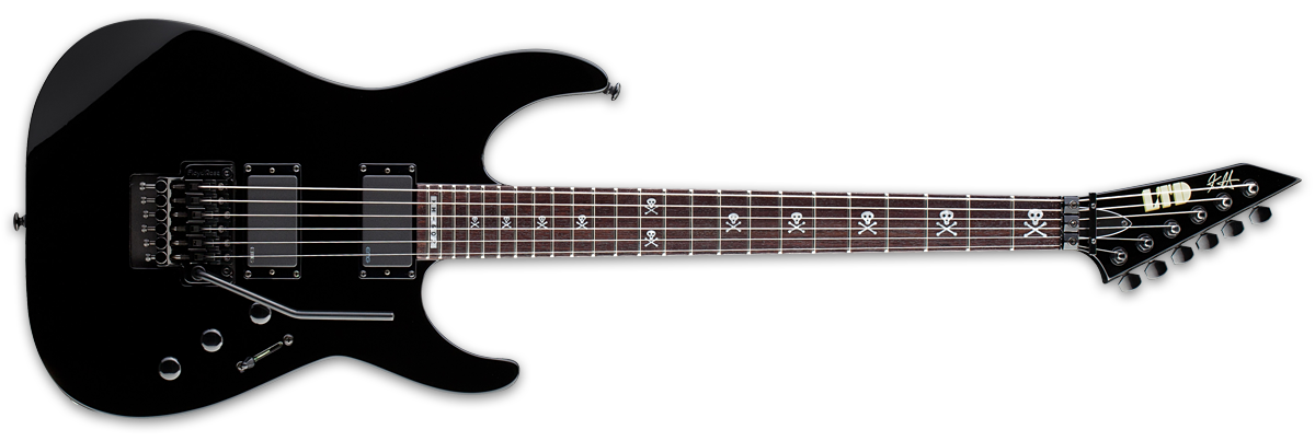 Guitarra Kirk Hammet assinatura, com corpo em Aliso, braço em Ácer thru-body com perfil extrafino em U, escala em Rosewood de 25,5” com 24 trastes XJ, pestana 42mm Locking, carrilhões LTD, Ponte Floyd Rose, pickups activos EMG 60/81, hardware negro, acabamento Black. Inclui estojo rígido.