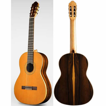 Guitarra clássica de fabrico espanhol, tampo em Cedro ou Abeto, aros e fundo em Ziricote, braço em Mogno africano, escala em Pau Santo da Índia, dois perfis com chapas.