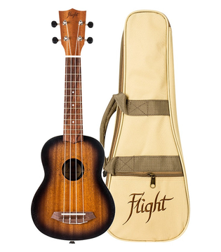 Ukulele Soprano. Corpo em Sapele Africano laminado. Braço em Okoumé Africano. Ponte e escala em nogueira. Cordas Flight Nylon. Inclui estojo.