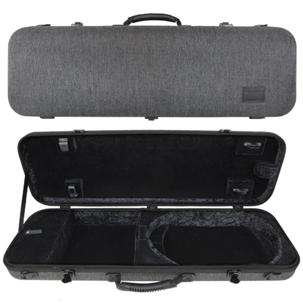 Estojo de violino ecológico, com casco de linho orgânico, sistema acolchoado de suspensão, peso aproximado de 2,3kg, asa flexível, suporte giratório de 2 arcos patenteado pela Gewa, compartimento para acessórios, 2 correias tipo mochila acolchoadas e amovíveis, exterior cinza e interior tipo veludo negro, com bolsa para partituras desmontável e asa de topo.