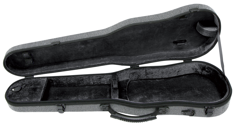 Estojo de violino ecológico, com casco de linho orgânico, sistema acolchoado de suspensão, peso aproximado de 1,6kg, asa flexível, suporte giratório de 2 arcos patenteado pela Gewa, compartimento para acessórios, 2 correias tipo mochila acolchoadas e amovíveis, exterior cinza e interior tipo veludo negro.
