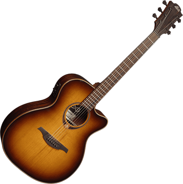Guitarra acústica electrificada com tampo maciço em cedro vermelho, lados, fundo e braço em Khaya. Escala e ponte em Brownwood. Carrilhões negros acetinados. Preamp Astro-Lag. Acabamento brilhante.