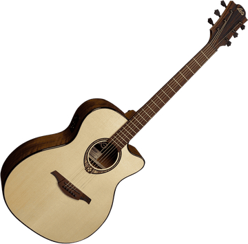 Guitarra acústica electrificada com tampo maciço em abeto Engelmann, lados e fundo em Ovangkol laminado e braço em Khaya. Escala e ponte em Brownwood. Carrilhões negros acetinados. Preamp Fishman INK3 com 3 bandas de eq e afinador. Acabamento brilhante.