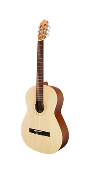 Guitarra clássica de fabrico nacional, com tampo em Carvalho europeu, fundo e laterais em Sapelli, braço em Mogno, acabamento natural satinado poro aberto.
