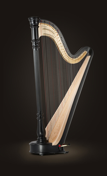Harpa em Abeto de 47 cordas, tessitura (Sol 0 - Dó 7), altura 185cm, largura 98cm caixa de ressonância 55cm, peso 37,6Kg.