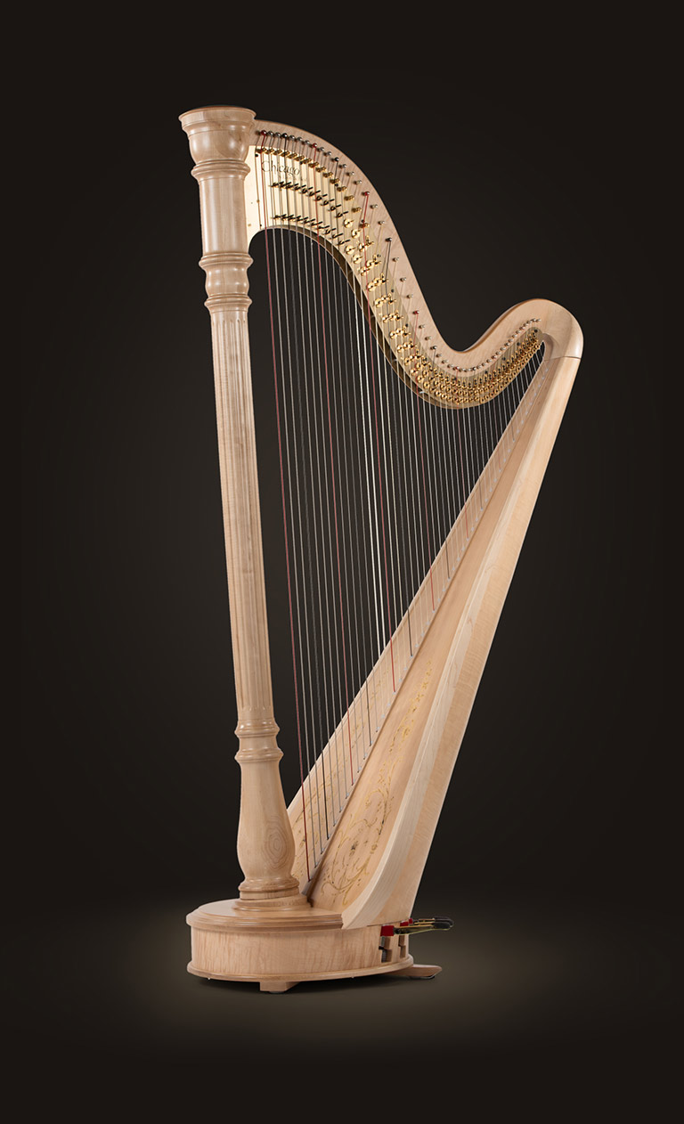 Harpa em Abeto de 47 cordas, tessitura (Sol 0 - Dó 7), altura 185cm, largura 98cm caixa de ressonância 55cm, peso 37,6Kg.