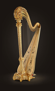 Harpa premium em Abeto com decoração a ouro de 23Kilates, 47 cordas, tessitura (Sol 0 – Dó 7), altura 190cm, largura 104cm caixa de ressonância 55cm, peso 39Kg.