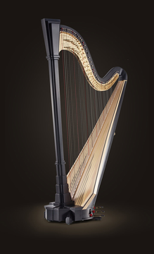 Harpa profissional em Abeto de 47 cordas, tessitura (Sol 0 – Dó 7), altura 191cm, largura 101cm caixa de ressonância 56cm, peso 39Kg.