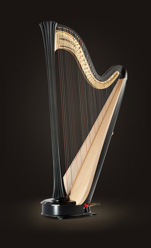 Harpa profissional em Abeto de 47 cordas, tessitura (Sol 0 – Dó 7), altura 187cm, largura 98cm caixa de ressonância 55cm, peso 35Kg.