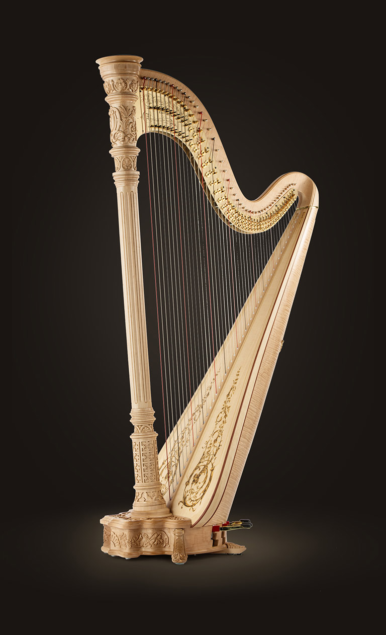 Harpa profissional em Abeto de 47 cordas, tessitura (Sol 0 – Dó 7), altura 188cm, largura 98cm caixa de ressonância 55cm, peso 37Kg.