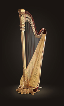 Harpa premium em Abeto com decoração a ouro de 23Kilates, 47 cordas, tessitura (Sol 0 – Dó 7), altura 189cm, largura 98cm caixa de ressonância 55cm, peso 37Kg.