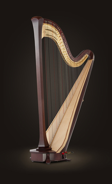 Harpa profissional em Abeto de 47 cordas, tessitura (Sol 0 – Dó 7), altura 185cm, largura 99cm caixa de ressonância 56cm, peso 37Kg.