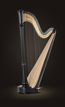 Harpa profissional em Abeto de 47 cordas, tessitura (Sol 0 - Dó 7), altura 187cm, largura 99cm caixa de ressonância 55cm, peso 37Kg.