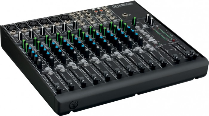 Mesa de mistura com 14 canais (6 mono + 4 stereo), phantom power, inserts, 2 auxiliares.
