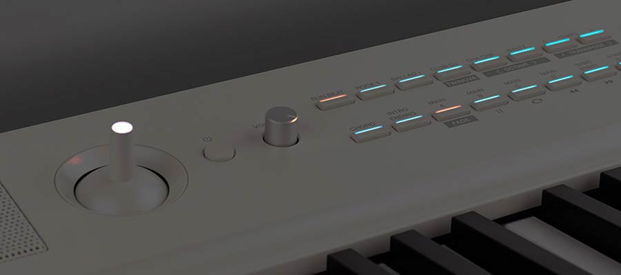 Controlo de estilo: Start/Stop, Sync Start, Intro/Ending, Main A/Fill A, Main B/Fill B, Main C/Fill C, Main D/Fill D, Chord On/Off, Fade In/Out