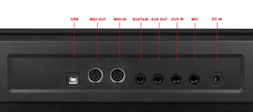 Ligações: DC IN, auscultadores (tomada de 1/4 polegadas), pedais, Sustain, microfone (tomada de 1/4 polegadas), USB, MIDI in/out, Aux-In/Aux out (tomada estéreo de 1/4 polegadas)