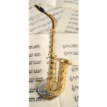 Miniatura de Saxofone fornecida em caixa forrada a veludo vermelho.