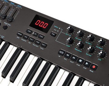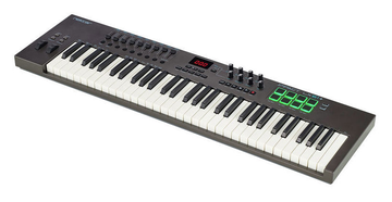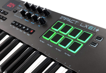 Teclado Controlador USB MIDI Impact LX61+ de 61 teclas sensíveis à velocidade tipo sintetizador. 8 x Botões rotativos, 1 x Fader 30mm. 8 x Pads sensíveis à velocidade e iluminados por LED's de 4 cores
