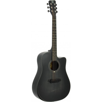Guitarra acústica electrificada, formato dreadnought, com cutaway, rebordo Confort para maior comodidade, tampo maciço em Picea, aros e fundo em Sapelli, ponte e escala em Compound Rosewood, carrilhões fechados com borboleta preta, cordas Addario, pickup com controlo de equalizador e volume, acabamento mate transblack.