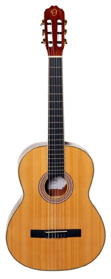 Guitarra Clássica com Truss Rod, tampo em Pinho, aros e fundo em Sapele, escala em Ovangkol, sanefa dupla em ABS, acabamento brilhante. Saco acolchoado de 10mm incluído.
