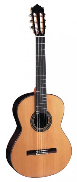 Guitarra clássica espanhola,tampo em cedro maciço, aros e fundo em Pausanto da Índia maciço, largura de concerto, braço em cedro com reforço interior em ébano, escala em ébano de 20 trastes, carrilhões de luxo, cordas Savarez Alliance, acabamento brilhante.