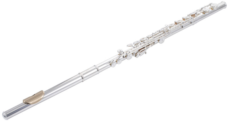 Flauta transversal com cabeça em prata, corpo, pé e mecanismo prateado, embocadura ouro 12,5% chaves alinhadas, chaves abertas, pano interior e exterior, vareta, estojo e bolsa para o estojo.
