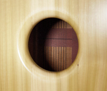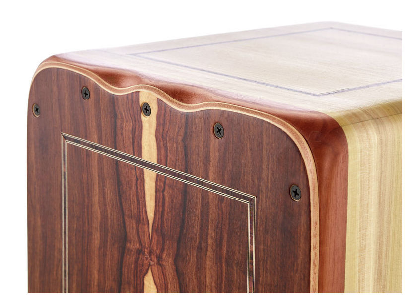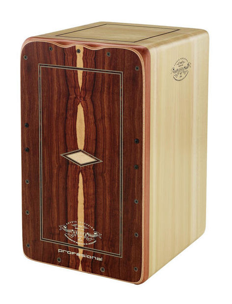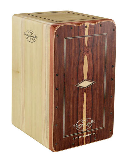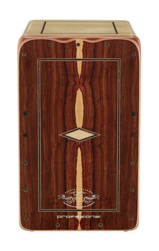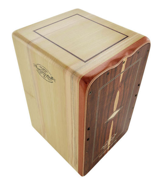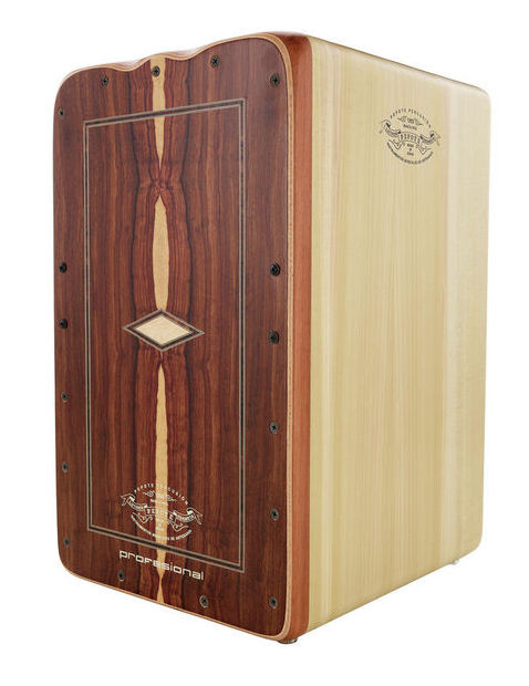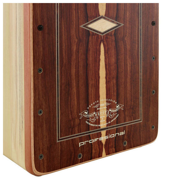 Cajon de gama profissional, em Imbuia, 28.5x30x47, 10 bordões com afinação, independentes à esquerda e à direita.