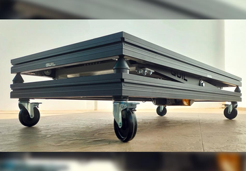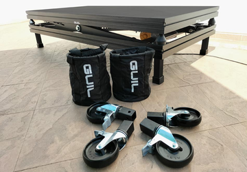 Plataforma motorizada profissional de alumínio com dimensões de 2×1 m, equipada com 4 rodas giratórias com travão e 4 pernas fixas, ideal para eventos que exijam apresentações dinâmicas e de impacto visual.