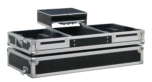Flight case DJ para para 2 leitores e 1 mesa de 31cm largura cada. Plataforma deslizante para portatil, compartimento para interface ou disco externo.