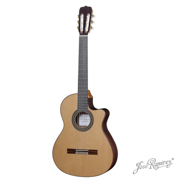 Guitarra clássica electrificada com pickup RMC Midi Polydrive IV idêntico à que equipam as famosas Godin Multiac. Com tampo em Cedro Vermelho maciço, fundo e laterais em Pausanto da Índia maciço, escala em Ébano, braço em Cedro, ponte em Pausanto da Índia, verniz de polioretano, cordas Ramirez de tensão alta com 3o em carbono,