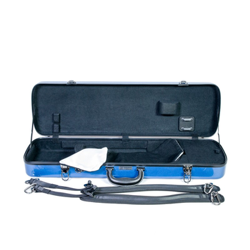 Estojo de violino 4/4. Estojo em compósito. Acabamento metalizado. Interior em veludo. Espaço para 2 arcos. Compartimento para acessórios. Espaço para almofada. Fecho de segurança. Correias tipo mochila. Peso: 2,5kg.