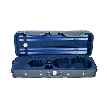 Estojo para violino rectangular, exterior em Lona Oxford negra, interior em veludo azul, 3 compartimentos de acessórios, suporte para 4 arcos, peso 2kg.